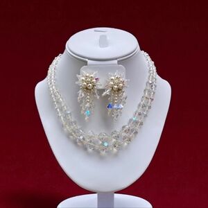 Vintage Crystal Necklace and Crystal Fuax Pearl Earrings Jewelry Set
