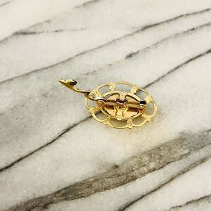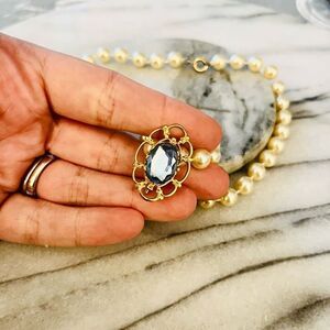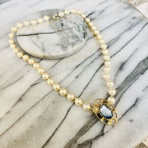 Vintage Crystal Pendant with Faux Pearl Necklace Blue Gold Toned Metal Cream