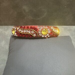 Exquisite vintage bangle adorned with vibrant red and yellow crystal rhinestones. Elegant design with gold-tone accents offers a distinctive touch for formal occasions.