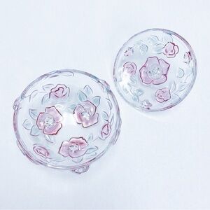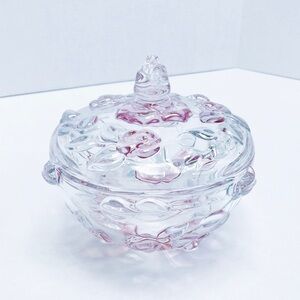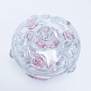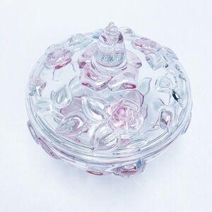 Vintage crystal candy jar with lid. Rose detail all over with pink petals and green leaves. Anthropologie tagged for exposure only.