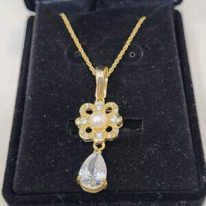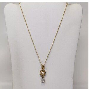 Vintage Crystal Teardrop Pearl Pendant Gold Tone Chain Necklace