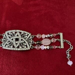 Beautiful Vintage Crystal and Pink, Clear and Smoke Beads Bracelet. Art Deco Design. Handmade. Length: 8 1/2 inches Width 1 1/2 inches