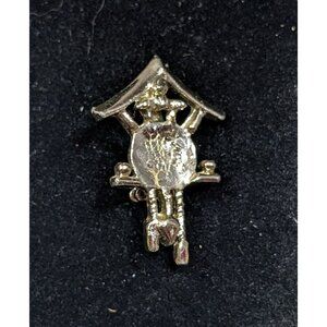 Charming vintage silver tone cuckoo clock brooch with intricate details, perfect for collectors. Note: Missing a piece but still a unique statement accessory for any ensemble.