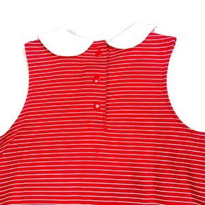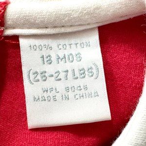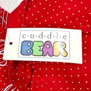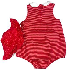 Vintage Cuddle Bear red and white romper with matching cap. Polka dot and striped pattern with flower embroidery. There are three snaps on the back and at the bottom. The cap has two ties. The fabric is 100% cotton. Label size is 18 months, 25-27 pounds. New with tags.