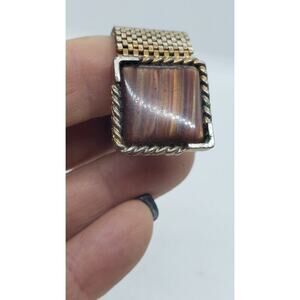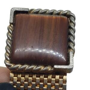 Great pair of retro mid-century 1950's cufflinks featuring wrap around mash and gold electroplate. A large square Accent piece that looks like wood but is actually loose sight and surrounded by twisted border. Comes with tie bar.
