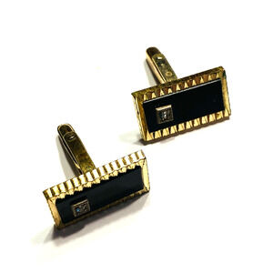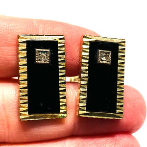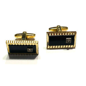 Vintage Cufflinks by Amerik Textured Goldtone Black Onyx & Clear White Crystal