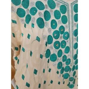 • Flaws: There is some discolorations around the sleeve hems (no stain removal techniques have been used) also there are a few loose threads on the embroidery