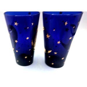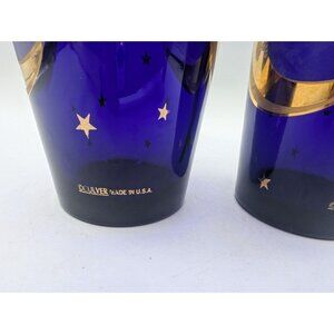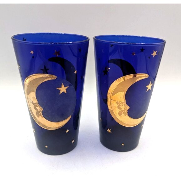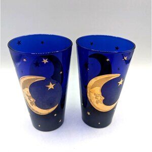 This set of two vintage Culver glasses features a deep cobalt blue color with a stunning gold moon and star design. Made in the USA, these glasses hold 16 ounces each and are ideal for serving beverages while adding a celestial theme to any table setting.