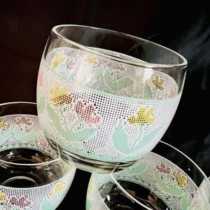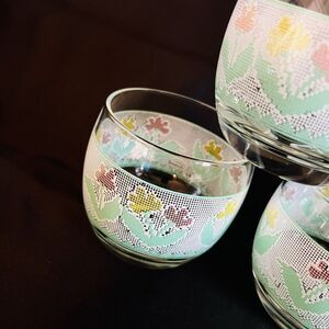 Elevate your drinking experience with this stunning set of vintage Culver roly poly rocks glasses. The intricate floral pattern featuring pastel tulips and irises is signed by the renowned brand, adding to its charm. This four-piece set is perfect for adding a touch of elegance to any occasion, whether it be a formal dinner or a casual night in with friends. The clear glass color allows the beautiful floral design to stand out, making it a great conversation starter. Ideal for collectors or those who appreciate unique drinkware, this set is a must-have for any barware collection. Very nice Condition.