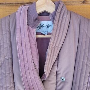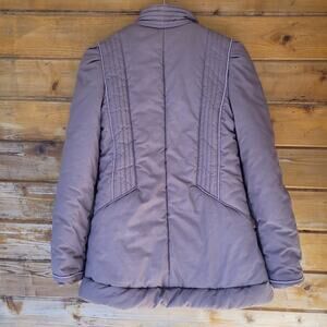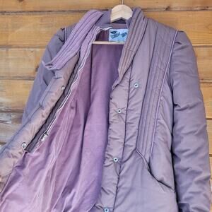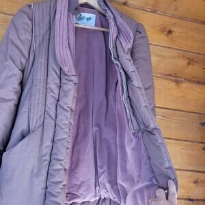 this is a light purple vintage cozy coat by Current Seen. size small. cotton/poly outer and cotton corduroy lining. zip and snap closure. front side pockets.