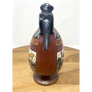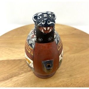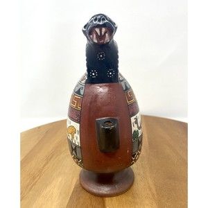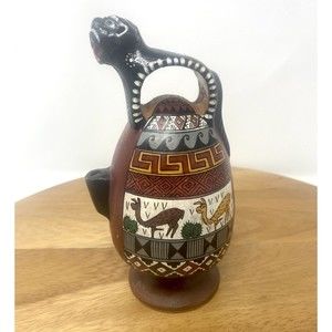 Vintage Cusco Peru Art Pottery Chicha Jug Pitcher Painted Jaguar Llamas 7.5 Inch