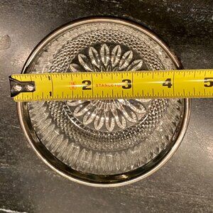 Add a touch of antique elegance to your dining table with this stunning round cut glass bowl from early 20th Century (1911-1940). The clear bowl with a glossy finish has a diameter of 4.5 inches and a depth of 2 inches. It features a banded silver plated metal rim that adds a touch of sophistication to its design. This vintage serving bowl is perfect for all occasions and comes with care instructions of hand wash only. The bowl is hand-blown in United Kingdom and weighs 2 pounds. It is a great addition to your collection of decorative cookware, dinnerware & serveware. Pictures are part of the description. Some tarnishing on the silver plate rim otherwise no chips or cracks.