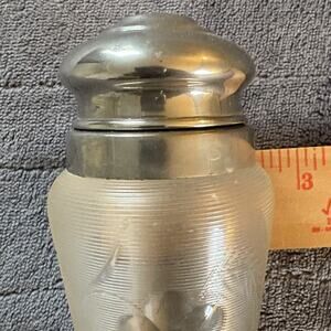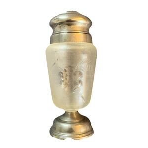 This Vintage Cut Glass Jar with Metal Base & Lid is a small, clear glass jar with a floral pattern, standing at 6.25 inches tall and 2.5 inches wide. This antique piece is perfect for storing sugar or can also be used as a spoon holder or lepelvaasje. Its unique design and vintage charm make it a special addition to any kitchen storage and organization collection.