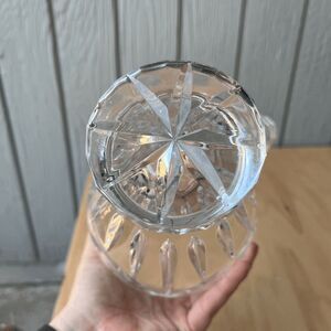 Classic and eye-catching, this vintage cut glass pitcher features intricate etched florals across the body, a deeply faceted base, and a sturdy, decorative handle. Whether you're pouring lemonade on the porch or setting a formal holiday table, this piece brings elegance and vintage charm to any setting.