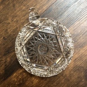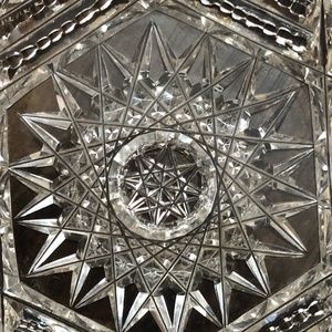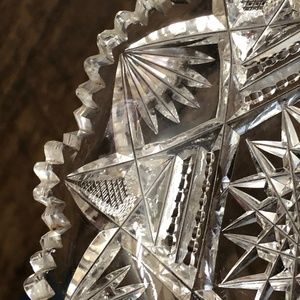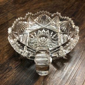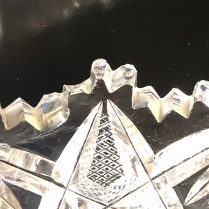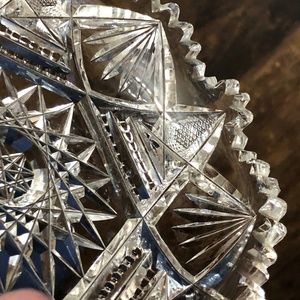 Lovey clear cut glass candy dish or relish tray with single curled cup-style handle. Glass is cut in intricate sunburst, starburst, diamond, sawtooth cuts. The rounded handle is smooth. There is only one chip that I could see - see last picture. It's on the sawtooth edge so it is hard to notice. I'm not entirely sure it is a chip but instead just an awkward cut in the sawtooth design.