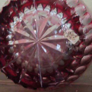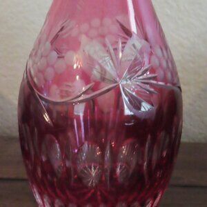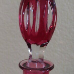 This is a vintage cranberry red decanter made of hand-blown cut crystal glass. It features a lid/stopper and is marked as unbranded. The decanter is 16 inches tall with stopper. Decanter without stopper is 12" tall. It is a beautiful piece of drinkware and barware that would make a great addition to any collection.