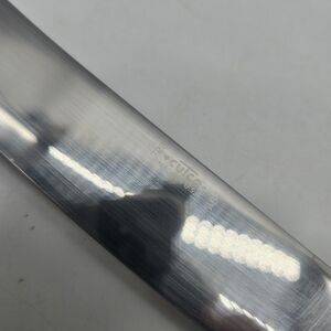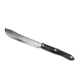 The Vintage Cutco 1722 Butcher Knife is a classic kitchen tool with a 8-inch stainless steel blade and a brown and orange swirl handle. Made in the USA, this knife is designed for cutting and chopping meat with its straight blade edge. The Cutco brand is known for its high-quality knives, and this butcher knife is no exception. With a lifetime manufacturer warranty, this knife is a reliable and durable addition to any kitchen.