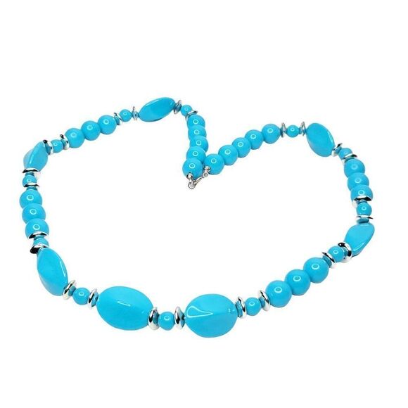 Vintage Cyan Azure Blue Silver Lucite Bead Necklace Round Oblong 24.5"