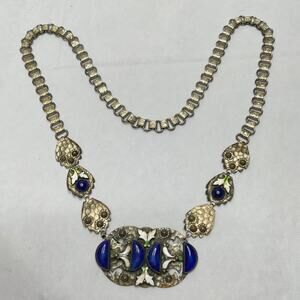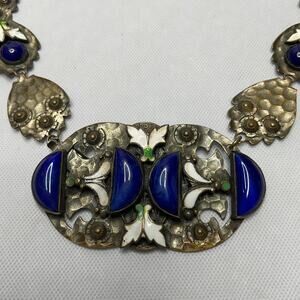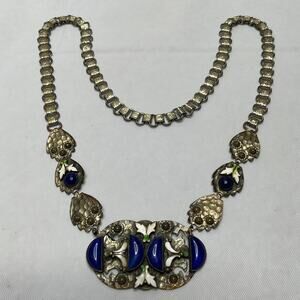 This stunning vintage Czech Art Deco statement necklace dates to the late 1920s–1930s. The silver-tone book chain leads to hammered floral side panels and a large central plaque. The centerpiece features three deep cobalt blue enameled cabochons, flanked by hand-painted white and green enamel floral motifs, set on a textured pot-metal base with raised floral details.