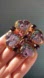 Charming brooch with purple heart motifs. Set in a gold frame. Accented with sparkling gems.