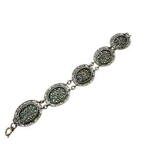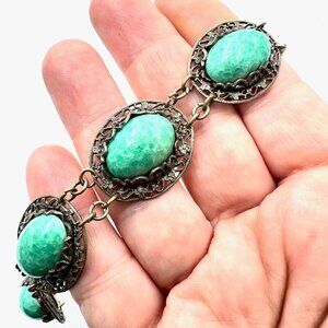 Vintage Czech Green Peking Glass Antiqued Gold Tone Bracelet 7 Inch