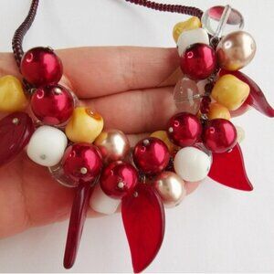 A vintage necklace in Rich jewel tones: cranberry red, clear and caramels.