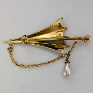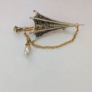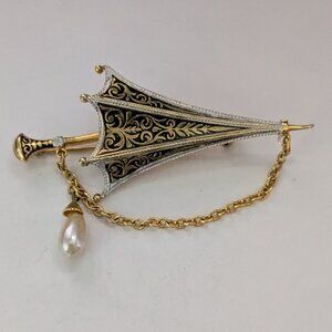 Vintage DAMASCENE Umbrella Dangle Pearl Brooch Pin