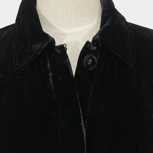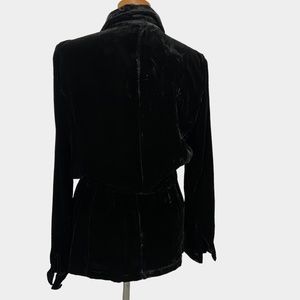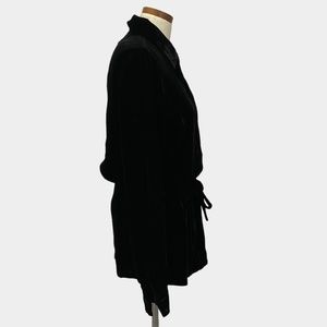 Gorgeous, thick, plush black velvet shirt jacket. Hidden velvet buttons go all the way up the neck on a silky placket ending with a tiny rouleau button at the throat to fasten securely. Waist cinches with a velvet self tie. Pockets at sides. Extra buttons sewn in by tag. Wear it open over a dress or cami. Or wear it buttoned and cinched for full dramatic effect. 82% rayon 18% silk. Very good condition. Measures approx 18” across and 29” in length. Size S