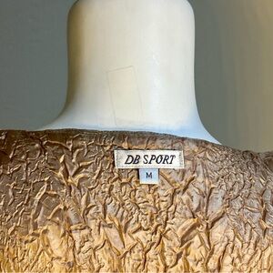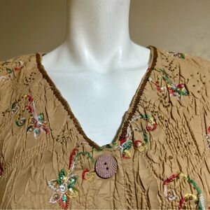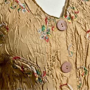 Beautiful vintage DB Sport women’s jacket size M. Crinkle (gathered/gaffered) textured fabric so soft with a quilted feel richly embellished with multicolor embroidery, sequins and beads. The V-neck collar is fully decorated with beads for an elegant, detailed finish. Front button closure with four tone-on-tone beige buttons (appear to be wood or wood-look plastic). The jacket has a slightly padded/structured feel and is lined — the inner side shows the same compressed/crinkled treatment. Long sleeves, slightly fitted waist; lightweight but with supportive structure, perfect for dressy or boho-chic styling.