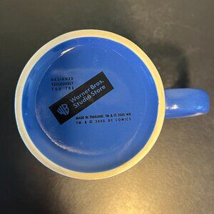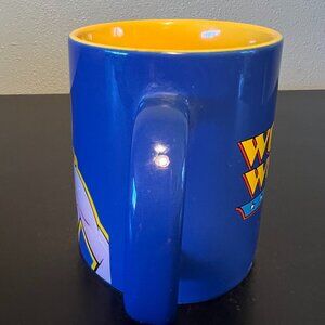 Vibrant royal blue with yellow and red ceramic mug features a bold graphic of Wonder Woman. The other side features yellow with red shadowed text reading WONDER WOMAN above the logo. Bright yellow interior. Please note: There are discoloration marks below the logo that appear to be a result of the manufacturing process. See enlarged photo. Measures 4.25” tall with a 3.25” diameter; 5” across including the handle. Holds 14 fluid oz. Designed exclusively for the Warner Bros Studio Store. Made in Thailand. © 2000 DC Comics.