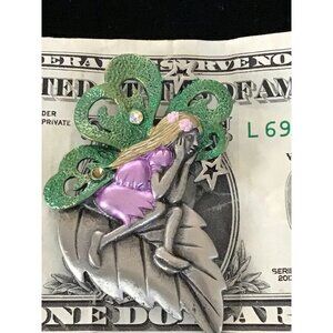 Vintage DD Pewter and Enamel Fairy Brooch With Aurora Borealis Rhinestones