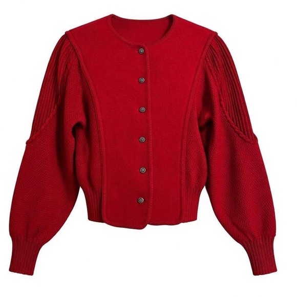 Keywords: DEANS, Scotland, red cardigan, wool sweater, button front, textured knit, puff sleeve, vintage inspired, classic, cozy, fall fashion, winter wear, cabincore, normcore, Vtg, cottagecore, heritage knitwear, structured knit