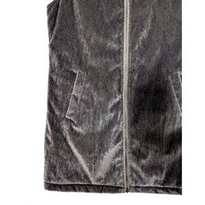 Faux fur full zip vest jacket women's size medium in a lovely stone gray color with brass hardware. Functional side pockets. Extremely well made with a faux fur that feels like calf skin or full grain hide. Long line cut provides extra coverage at the bottom. Super comfortable and cozy. Lined throughout in satin for extra comfort on the interior.