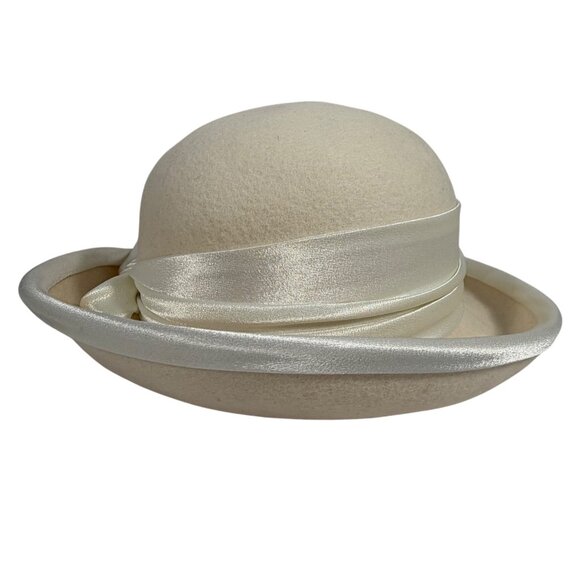 A sophisticated cream felt bowler hat with a satin ribbon trim, ideal for formal gatherings or special occasions. Offers timeless elegance and refined style.