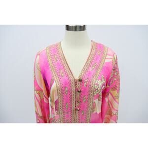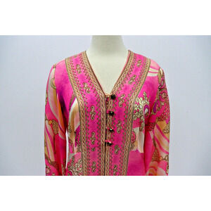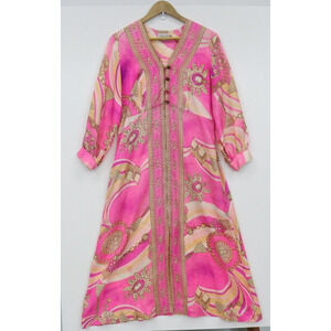 This beautiful Vintage Dela-Ann lounge kaftan dress is a must-have for any fashion-forward woman. The stunning pink, orange, and gold paisley, gem, and glam pattern is perfect for a casual summer day or a fancy party/cocktail event. The dress features a V-neckline and puff sleeves, adding a touch of elegance to the overall look. The dress is made of a high-quality satin blend material and has a long dress length, making it suitable for any season. The dress comes in a size M and has a zipper and button closure. Its bohemian, retro, and colorful theme is perfect for anyone who wants to stand out. Don't miss out on this vintage gem!