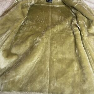Relevant details: Vintage style, faux suede shell, faux fur shawl collar and wrist cuffs, button closure, two front pockets, faux fur interior, warm and cozy outerwear