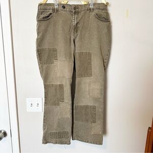Vintage DG2 by Diane Gilman patchwork denim jeans. Size 16WP, good vintage shape. Parch work on the front legs of jeans, extra button added to the side. Olive green in color.