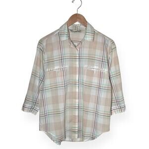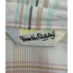 Vintage DIANE VON FURSTENBERG Button Up Blouse Top 3/4 Sleeve Plaid Pink Green S