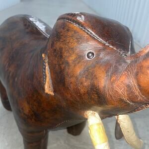 Small Dimitri Omersa vintage leather elephant footstool for Liberty of London/Abercrombie & Fitch. This item is unmarked or signed by its maker.