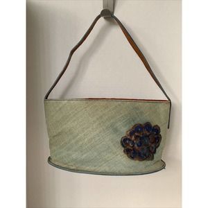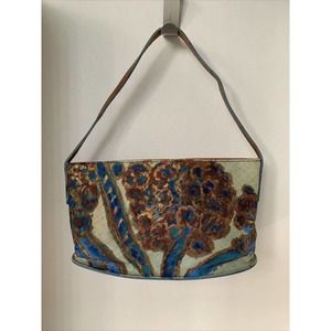 The base fabric under the paint and showing is light green to tan natural fiber. The strap and complete bottom of the handbag is a matching sable leather. The edges of the strap are blue tinted and the visible stitching is a matching cobalt blue. Bag measures: 12" x 7" x 4.5". The bottom is an oval shape.