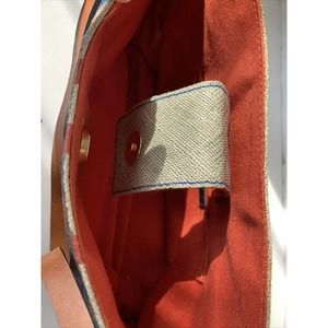 The leather bottom has a few scratches and an area of discoloration. The interior is a burnt orange-red color. Condition is "Pre-owned".