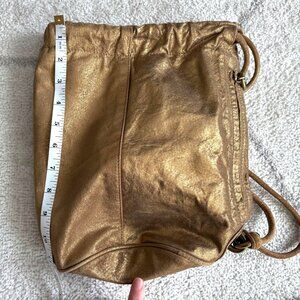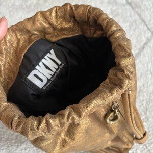 Tags: DKNY backpack, metallic leather bag, vintage DKNY purse, 90s leather backpack, gold shoulder bag, drawstring leather backpack, DKNY metallic gold, designer leather backpack, retro DKNY bag, vintage metallic purse