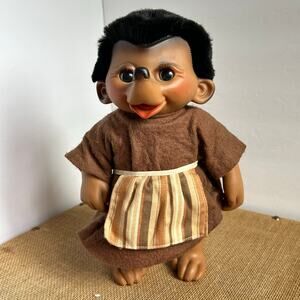 Charming vintage DVP APS troll doll made in Denmark. This collectible 12" doll features the classic expressive face, rooted black hair, and a handmade brown felt dress with a striped apron.