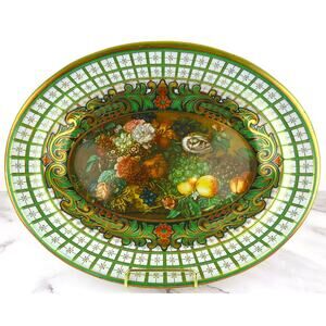 This vintage tin tray by Daher Decorated Ware features a richly colored still life of flowers and fruit in the center, framed by an ornate green, gold, and white geometric border. Designed in Long Island, NY and made in England, these trays were popular in the 1960s–1970s as both functional serveware and decorative wall hangings.