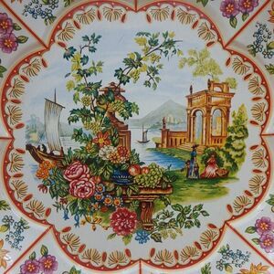 I have 2 of these beautiful vintage bowls. Both in excellent condition. Floral around sides, in the middle is a garden scene. 10" in diameter, 1 3/4" tall.