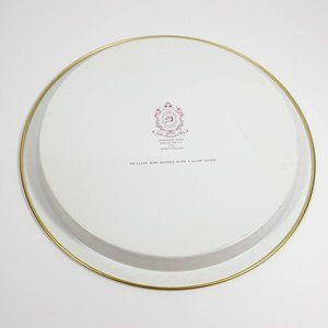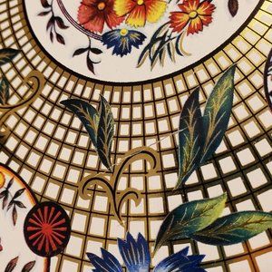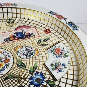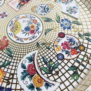 DESCRIPTION: White, circular metal tray with intricate floral pattern. The tray has a metallic gold grid design in the background and a floral design around the rim as well.