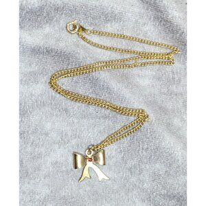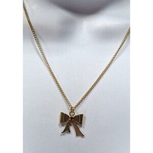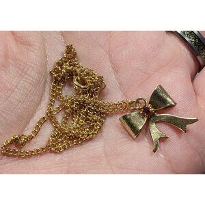 Vintage Dainty Coquette Gold Tone Bow Necklace With Red Gem