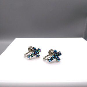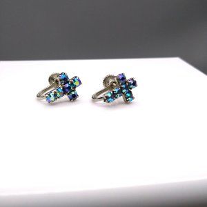 Vintage Dainty Crystal Cross Earrings with Blue AB Sparkle, Classic Tiny Screw Back