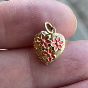 Vintage Dainty Mini Small Heart Locket Charm Gold Tone Pendant Enamel Flowers