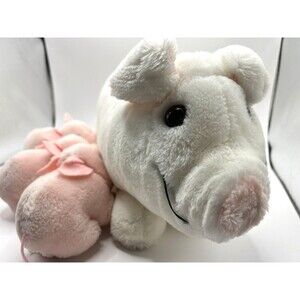 Vintage Dakin Plush White Pig with 3 Pink Piglet Babies Stuffed Animal 17” 1980s